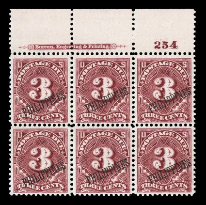 766 ogPB J6 image#J6, 3c Deep claret, full top margin imprint and plate no. 254 block of six, rich vibrant color, well centered, disturbed o.g. from interleaving, very fine. (Image) $875.00