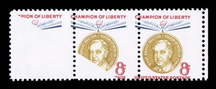 801 nh 1137a image#1137a, 8c Reuter, ocher omitted, horizontal strip of three, being positions 30-32 from the unique sheet which had a piece of paper on top during the printing process, affecting only a small number of stamps on the sheet, with position 30 being the error stamp o.g., n.h., very fine; only three such errors exist; photocopy of a 1996 PF certificate for the original sheet before it was broken up. (Image) $4,250.00+