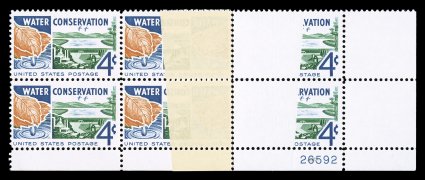 802 nhPB 1150a image#1150a, 4c Water Conservation, brown orange omitted, a spectacular bottom margin plate no. 26592 block of six, with the right two stamps having the brown orange omitted due to a small piece of paper having been on top during the printing process, leaving four stamps with only a partially printed design and the brown orange color completely omitted, in fact the extra paper is still attached to this multiple, clearly showing how this error occurred, o.g., n.h., very fine; this plate block represents two of the four known examples of this error and is the only one to show the extra paper still attached; cataloged as two singles. (Image) $4,800.00+