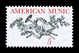 803 nh 1252a image#1252a, 5c American Music, blue omitted, select example of this very scarce and striking color missing error, wonderfully well centered, o.g., n.h., extremely fine; according to Datz only 20 to 40 errors exist. (Image) $900.00