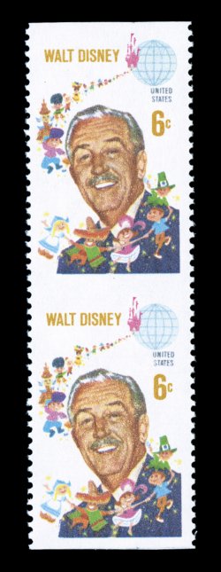 809 nh 1355b image#1355b, 6c Walt Disney, vertical pair, imperforate horizontally, bright and fresh, o.g., n.h., a few light fingerprints on gum, very fine; only 50 pairs were ever issued; 1991 PSE certificate. (Image) $650.00