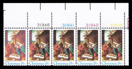 818 nh 1414b image#1414b, 6c Christmas, black omitted, top margin plate number strip of five, the left stamp being the black omitted error, o.g., n.h., very fine; quite desirable in this transition format. (Image) $475.00+