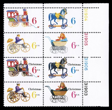 821 nhPB 1418f image#1418f, 6c Toys se-tenant block, black omitted on top two stamps, right margin plate number block of eight, with the top two stamps having the black completely omitted (#1415b, 1416b), the next two stamps with the black partially omitted, and the bottom block normal, o.g., n.h., trivial gum disturbance on one stamp, very fine; an immensely rare transitional error block, which may be unique in this format; 2001 PF certificate; Scott inexplicably prices the block the same as two singles, although it is rarer and much more desirable as a block. (Image) $5,000.00+