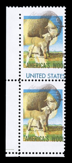 826 nh 1423b image#1423b, 6c America's Wool, teal blue omitted, bottom margin pair, with the bottom stamp being the error, caused by an upward shift of the teal blue color, o.g., n.h., very fine; an eye-catching error, of which only 6-8 examples exist according to Datz. (Image) $600.00