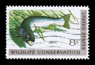 827 O 1427a image#1427a, 8c Trout, red omitted, used single, near perfect centering and with unobtrusive wavy machine cancel, extremely fine; a great modern error rarity and tremendously underrated, as this is the unique used example and the only other example is contained in the unique se-tenant block of four; 1973 APS and 1996 PF certificates. (Image) $1,250.00