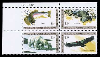 828 nhPB 1430b image#1430b, 8c Wildlife Conservation se-tenant block of four, light green and dark green omitted (from #1427 and #1428), the unique plate no. 33032 block of four, brilliantly fresh, exceptionally well centered, o.g., n.h., extremely fine; one of only eight known error blocks and the sole plate block in existence. (Image) $4,500.00+