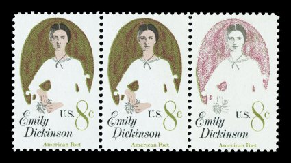 832 nh 1436b image#1436b, 8c Emily Dickinson, pale rose offset color omitted, the right stamp in a horizontal transition strip of three, with the other two stamps being normal, a fabulously rare modern error with only three or four examples known, the missing pale rose color is actually a flesh color, the absence of which results in Emily Dickinson's face and hands being totally colorless, additionally the dark green background is nearly totally and strikingly omitted, the right stamp has a portion of the pale rose and dark green background colors omitted, well centered, o.g., n.h., extremely fine; one of the highlights of the "Crossings" color-omitted error collection; 1995 PSE certificate. (Image) $6,500.00+