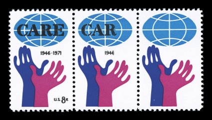 833 nh 1439a image#1439a, 8c CARE, black omitted, a very rare transitional horizontal strip of three, left stamp normal, the middle stamp with black partially omitted, and the right stamp with the black completely missing, o.g., n.h., extremely fine and visually striking; a major missing color error of which only ten are thought to exist; 1998 PF certificate; ex-Floyd. (Image) $2,750.00+