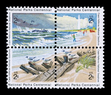 836 nhbl 1451b image#1451b, 2c Cape Hatteras National Parks Centennial se-tenant block of four, black lithography color omitted, an impressive example of this subtle but very rare missing color error, o.g., n.h., very fine; only one sheet was ever discovered yielding 25 blocks; photocopy of a 1975 APS certificate for the nearly complete sheet. (Image) $1,500.00