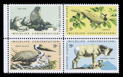 839 nhbl 1467d image#1467d, 8c Wildlife Conservation se-tenant block of four, red and brown omitted, a choice left sheet-margin example, o.g., n.h., trivial tiny inclusion in top left stamp, extremely fine; a very popular and enormously rare error with only eight blocks of four exist. (Image) $4,000.00