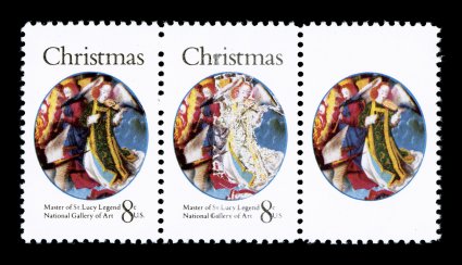 842 nh 1471b image#1471b, 8c Christmas, black omitted, a highly desirable transitional error strip of three, the left stamp normal, the middle stamp with black partially omitted in the central design and the right stamp with the black inscriptions completely missing, o.g., n.h., extremely fine; an exceptionally rare modern error, as only ten can exist; 1976 APS and 1998 PF certificates. (Image) $3,500.00+