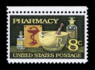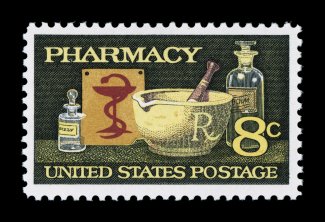 843 nh 1473a image#1473a, 8c Pharmacy, Blue and orange omitted, o.g., n.h., very fine; accompanied by a 1994 PF certificate that erroneously classifies this as the blue only omitted error (#1473b). (Image) $750.00