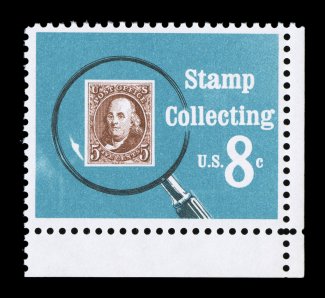 845 nh 1474a image#1474a, 8c Stamp Collecting, black (lithography) omitted, bottom right corner margin single, o.g., n.h., very fine; an error with great thematic appeal. (Image) $550.00