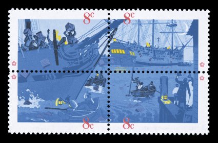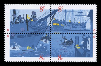 847 nhbl 1483b image#1483b, 8c Boston Tea Party se-tenant block of four, black (engraving) omitted, a well centered example of this striking missing color error, o.g., n.h., very fine; only 32 blocks have been recorded. (Image) $1,250.00