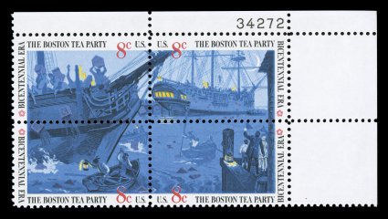 846 nhbl 1483b image#1483b, 8c Boston Tea Party se-tenant block of four, black (engraving) omitted, bright and fresh, o.g., n.h., extremely fine; only 32 blocks exist; 1991 PSE certificate. (Image) $1,250.00