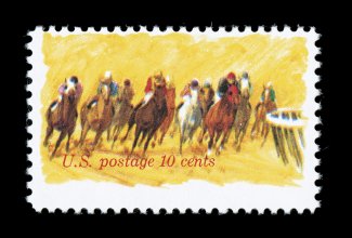856 nh 1528a image#1528a, 10c Horse Racing, blue omitted, centered to top as always, o.g., n.h., fine. (Image) $825.00
