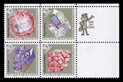 857 nhbl 1541b image#1541b, 10c Mineral Heritage se-tenant block of four, light blue and yellow omitted, top right margin Zip block of four, o.g., n.h., very fine; a very scarce and seldom offered error block. (Image) $1,750.00