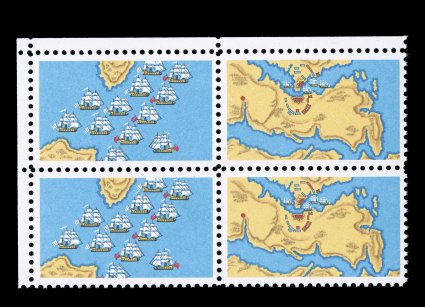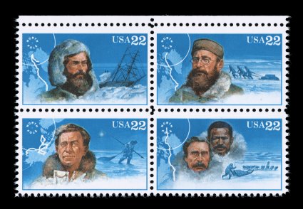 917 nhbl 2223b image#2223b, 22c Arctic Explorers se-tenant block of four, black (engraved) color omitted, a choice top sheet-margin example of this incredibly rare missing color error, one of only four such error se-tenant blocks known, exceptionally bright and fresh, well centered, o.g., n.h., extremely fine; a highly important missing color error from the modern era; 1992 PF certificate. (Image) $5,500.00