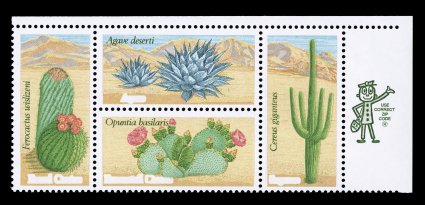 903 nhbl 1945b image#1945b, 20c Desert Plants se-tenant block of four, engraved deep brown color omitted, a choice top right corner sheet-margin Mr. Zip example of this important missing color rarity, leaving the block devoid of "USA/20c" denominations and cactus names, well centered, o.g., n.h., extremely fine; no more than twenty error blocks exist; 1992 PF certificate. (Image) $4,250.00
