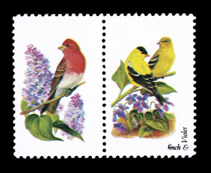 905 nh 1981b image#1981b, 20c New Hampshire state bird, black (engraving) omitted, being the left stamp in a horizontal transitional pair with the New Jersey stamp, which has its black color partially omitted as well, this is the only example known and is the basis for the Scott catalog listing; this and the unique Rhode Island and Wisconsin stamps are the only three color missing errors known from the entire 50 stamp series, o.g., n.h., very fine; 2000 PF certificate; ex-Floyd. (Image) $6,000.00