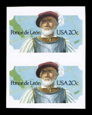 907 og 2024b image#2024b, 20c Ponce de Leon, vertical pair, imperforate between, with blind perforations at the sides, o.g. that is just slightly disturbed, very fine; an exceedingly rare error, being the first example we have ever offered in our auctions; 1991 PSE and 2000 PF certificates; listed but not priced in Scott. (Image) Est. $750-1,000