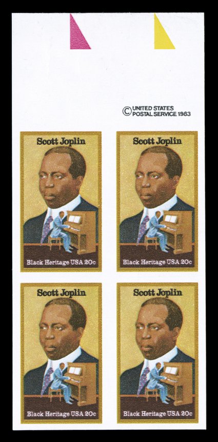 909 nhbl 2044a image#2044a, 20c Joplin, imperforate, top sheet-margin block of four, o.g., n.h., extremely fine; 1990 PSE certificate. (Image) $900.00+