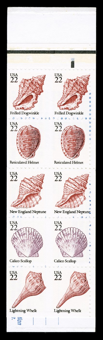 910 nhBP 2121c image#2121c, 22c Seashells, booklet pane of ten, vertically imperforate between, single booklet pane error still in the original booklet, o.g., n.h., very fine; only 30-40 panes have been reported; 1991 PSE certificate. (Image) $550.00
