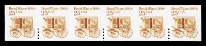 911 nh 2136b image#2136b, 25c Bread Wagon, pair, imperforate between, two such error pairs in a strip of six, being imperforate between the second & third stamps and the fourth & fifth stamps, o.g., n.h., very fine; Datz states only 10 pairs have been reported, making this a possible unique double error strip; 1990 PF certificate. (Image) $1,300.00+