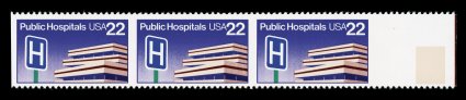915 nh 2210b image#2210b, 22c Public Hospitals, horizontal pair, imperforate vertically, right sheet-margin strip of three, o.g., n.h., a couple tiny gum skips, very fine; only 20 pairs exist; 1990 PSE certificate; cataloged as a pair. (Image) $1,250.00+