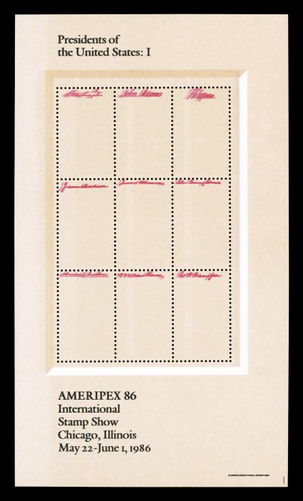 916 nh 2216j image#2216j, 22c Ameripex souvenir sheet, blue (engraved) omitted, also with the red showing an interesting triple printing due to tagging offset, o.g., n.h., very fine; a rare error, with only 5-6 reported examples; 1992 PF certificate. (Image) $2,500.00