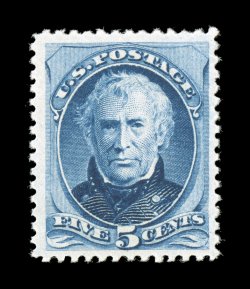 85 nh 185 image#185, 5c Blue, a remarkably fresh mint single, with beautiful rich color and a well incised impression on especially white paper, plus it is exceptionally well centered within uncommonly large margins, o.g., never hinged, choice very fine; 2000 and 2006 PF certificates; ex-"Beckley". (Image) $1,900.00
