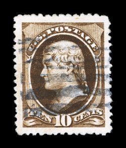 89 Ou 188 image#188, 10c Brown, with secret mark, a spectacular used example that features the largest margins imaginable and is marvelously well centered within these massive borders, strong rich color, cork cancel, extremely fine; a huge stamp; 2004 PSE certificate (XF 90 Jumbo; SMQ $120.00 for 90 and $330.00 for 95). (Image) $27.50