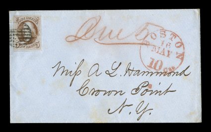 1000 c 1b image#1b, 5c Orange brown, an exceptionally attractive single with four large to extra-large margins, in addition it possesses marvelous orange brown color and detailed impression, tied to neat cover to Crown Point, N.Y. by scarcer black grid cancel, red "Boston/16 May/10Cts." and marked "Due 5", this must have been due to the weight as the distance is less than 300 miles, barest trace of age spots to cover, extremely fine and extraordinarily nice usage; ex-Bleuler. (Image) Est. $400-500