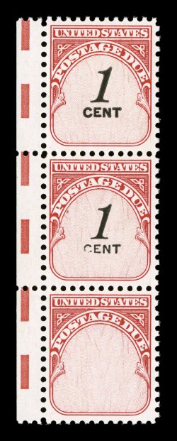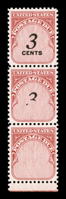984 nh J91a image#J91a, 3c Carmine rose, with "3 cents" omitted, a bottom sheet-margin vertical transitional error strip of three, the top stamp is normal, middle stamp with only a portion of the "3" numeral showing, and the bottom stamp has the black completely omitted, brilliantly fresh, well centered, o.g., n.h., very fine; transitional strips of this error are far scarcer than the "normal" pairs with and without black color; 1998 PF certificate. (Image) $675.00