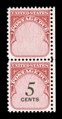 985 nh J93a image#J93a, 5c Carmine rose pair, one with "5 cents" omitted, right margin vertical pair, the top stamp the error, o.g., n.h., very fine; this is the rarest value of the denomination omitted postage due errors, with only ten such pairs believed to exist. (Image) $1,500.00