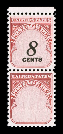 986 nh J96a image#J96a, 8c Carmine rose pair, one with "8 cents" omitted", a top sheet-margin vertical pair of this rare postage due error, with the bottom stamp having the value completely omitted, fresh, o.g., n.h., very fine; only twenty pairs exist; 1991 PSE certificate. (Image) $850.00