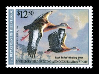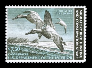 988 nh RW53a image#RW53a, 1986 $7.50 Hunting Permit, black omitted, a bottom right corner sheet-margin mint example of this striking missing color error, exceedingly well centered and margined, o.g., n.h., extremely fine; among the finest copies available of this popular and rare error; only 62 examples have been recorded; 1998 PSE certificate. (Image) $3,750.00