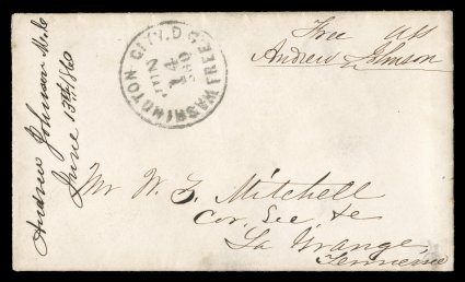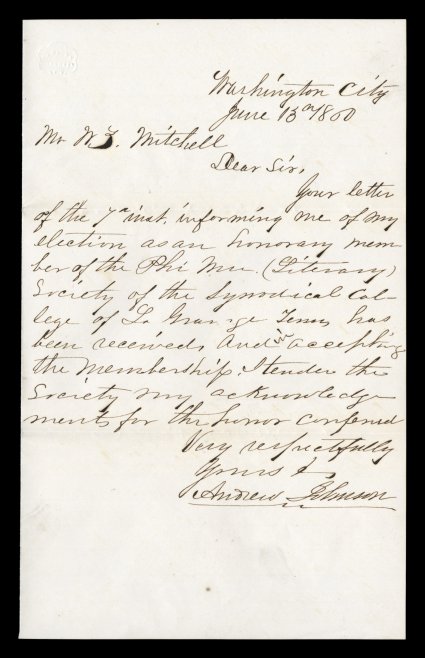 993 c imageAndrew Johnson, Seventeenth President of the United States, autographed letter signed while a Senator from Tennessee, datelined "Washington City/June 13th 1860", posted to W.Z. Mitchell of La Grange, Tennessee with a free-frank cover also with his signature, the letter is a thank you letter for being made an honorary member of the Phi Mu Literary Society of the Synodical College of La Grange, cover has a small piece missing from the backflap, otherwise both the letter and cover are in an excellent state of preservation and very fine; this letter was written just prior to the Civil War and Johnson was the only Senator from a secession state not to leave office when the war started leading to his eventual succession to the Presidency upon the assassination of President Lincoln. (imagea) (Image) Est. $750-1,000