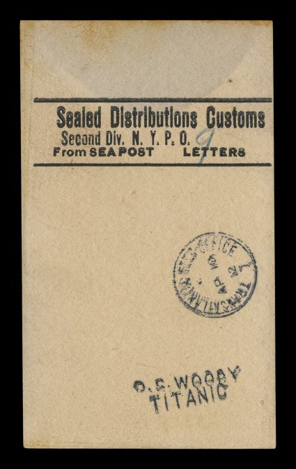994 imageTitanic Facing Slip for Sealed Distributions Custom, measuring 75x128mm, imprinted "Sealed Distributions Customs/Second Div. N.Y.P.O. 9/From Sea Post Letters" with the numeral "9" added in blue crayon, postmarked with "Transatlantic Post Office 7/AP 10 12" c.d.s., with additional handstamps of "O.S. Woody", U.S. postal clerk on the R.M.S. "Titanic", and "Titanic" handstamp identifying the ship where this sea post office was located, slight staining at top from exposure to sea water, very fine; the story of Oscar Scott Woody and the "Titanic" has been told many times; Woody, along with two other U.S. postal clerks and two British post office clerks, manned the post office on the R.M.S. "Titanic" and were responsible for handling the mail carried aboard this ill-fated ship which sank after hitting an iceberg on April 15, 1912, all five of these postal workers lost their lives working right up to the end attempting to preserve the mail; four different facing slips, instructional slips used for bound packages of sorted mail to be directed in different ways, were found on the body of Oscar Woody and salvaged with his few personal affects, these were prepared by Mr. Woody as the ship sailed on April 10, 1912; these facing slips are among the very few artifacts that were ever recovered relating to the postal history of this disaster; the facing slip offered here and the one in the next lot are two of only four slips that have been recovered, all of which are unique; a great postal history rarity. (Image) Est. $5,000-7,500
