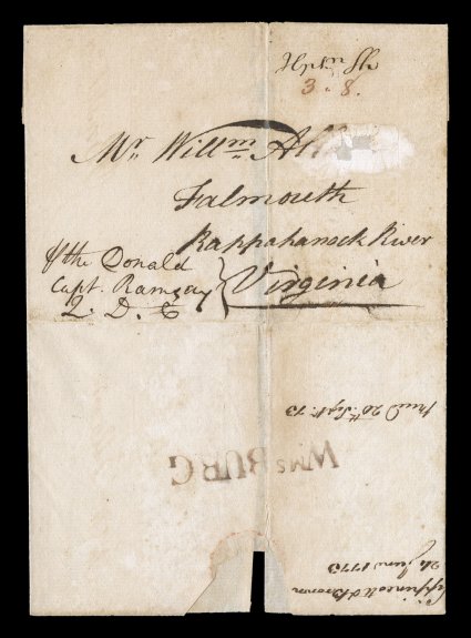 996 c image1773 Virginia Colonial cover to Falmouth, Rappahanock River, Virginia, posted from Bristol, England on June 24, 1773 and received September 20, 1773, posted as a ship letter with "P the 'Donald'/Capt. Ramsey/Q.D.C." (Quem Deus conservet, i.e. Whom God preserve), bearing two rare postmarks from this colonial period, the first being ms. "Hptn Sh", a Hampton Ship marking at the port of entry where it was rated "3.8." (3 dwt, 8gr which equals 2p ship fee and 8p postage), on the reverse clear "WmsBurg" handstamp, one of the few handstamp markings of this early period, portion of the last name in the address abraded away causing a small hole not affecting markings and light overall toning to the cover, markings are very fine and the cover is actually quite well preserved for this period; an extremely rare early transatlantic cover. (Image) Est. $2,000-3,000