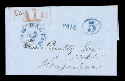 997 c image"BALTIMORE R.R. Md./May 2" blue handstamp on 1846 blue folded letter to Hagerstown, with matching "Paid" and "5" in oval, also large red boxed "Paid" at top, very fine and colorful; a scarce railroad marking. (Image) Est. $200-300