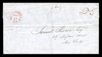 998 c image"Milledgeville/Ga./May 14" c.d.s. on entire 1845 Georgia folded map, posted to New York and actually quite a large sheet (about 16x20 inches), this is from the Surveyor Generals Office at Milledgeville, the map is a hand-drawn rendition showing all of the waterways of the southwest portion of the state and showing about 80% of the State of Georgia, small hole in the center of the map where the wax seal that sealed the entire was located, otherwise very fine and a fascinating document for the Georgia enthusiast; ex-Bleuler. (Image) Est. $200-300