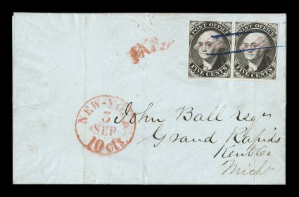 999 c 9X1b image#9X1b, New York, N.Y. 5c Black Postmaster Provisional, signed A.C.M., with periods after each letter, horizontal pair with ample to full margins all around, tied to light blue colored folded entire to Grand Rapids, Mich. by the usual two horizontal blue pen strokes, red arched "Paid" handstamp at left of pair, with matching "New York/3 Sep/10 cts." c.d.s. at bottom left, pair with rich color and a crisp impression, couple of light vertical file folds, one of which passes through right stamp in pair, otherwise very fine; very scarce style of initials, particularly when found on cover. (Image) $3,250.00