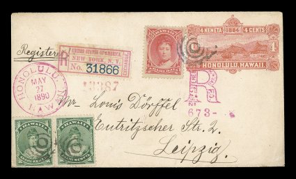 1043 c #42, 49, U3 image#49, 1883 $1.00 Rose red, an immensely rare postal usage of this high value along with 1c Green horizontal pair (#42; small perf. flaws) tied to registered 4c Red postal entire (#U3) by target cancels, magenta "Honolulu/Hawaii/May 27 1890" double-circle c.d.s. at left with matching "R" registry handstamp, posted to Leipzig, Germany via San Francisco and New York with transit markings and New York registry label, tiny piece added to the bottom backflap, very fine; this high value, picturing Queen Emma Kaleleonalani, was largely used for fiscal purposes because of its high denomination and a large portion of the remaining were overprinted "Provisional/Govt."; postally used examples are decidedly scarce and examples used on covers are major rarities of Hawaii with only a very few covers known, this being an exceptionally attractive example; ex-Bleuler. (Image) Est. $4,000-5,000