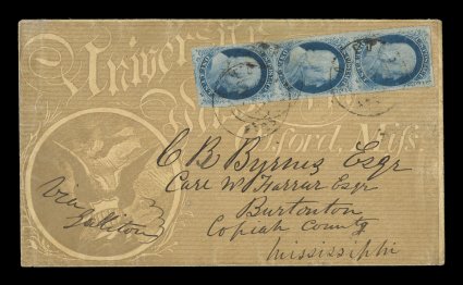 1049 c 7 image#7, 1c Blue, Ty. II, choice vertical strip of three with large margins on all four sides showing a bit of the next stamp at bottom, tied to all over front illustrated cover of the University of Mississippi at Oxford by two light strikes of Oxford, Miss. c.d.s., posted to Burtonton, Mississippi, trivial edge wrinkles to cover not affecting the stamps, very fine; a stunning early illustrated cover with an exceptional franking; ex-Bleuler. (Image) Est. $750-1,000