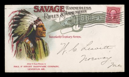 1050 c 301 imageSavage Hammerless Rifles and Ammunition advertising cover, a beautiful cover that is the model of perfection being a front and back advertising cover with magnificent Indian Chief illustration on the front with St. Louis World's Fair advertisement on the reverse, even the 2c Carmine (#301) is exceptionally well centered with deep radiant color, tied by a clear "Lewiston/Me/Aug 4 1904" flag cancel, extremely fine; simply a beautiful cover in every regard; ex-Bleuler. (Image) Est. $500-750