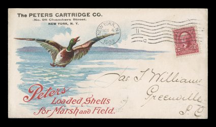 1051 c 301 imagePeter's Cartridge Co. advertising cover, beautiful multicolor front and back illustrated cover showing a soaring duck on the front and just as impressive are multicolor illustrations on the reverse of the various types of ammunition manufactured by this company, 2c Carmine tied by New York machine cancel, backstamped Greenville, S.C., exceptionally fresh and extremely fine; ex-Bleuler. (Image) Est. $400-500