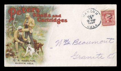 1052 c 319 imagePeters Shells and Cartridges advertising cover, a lovely multicolor view of Quail hunters and dogs on the front and allover back multicolor design on the reverse promoting their ammunition, 2c Carmine (#319), tied by a "Magnum/Okla/Jan 17 1904" duplex of Oklahoma Territory, backstamped Granite, Oklahoma, insignificant wrinkle to the cover, very fine and choice; ex-Bleuler. (Image) Est. $200-300