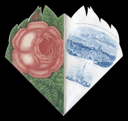 1056 c imageRose of Washington patriotic cover, an extremely scarce used example of this lovely handpainted three part design that is the epitome of Charles Magnus' work, endorsed by a member of Congress and posted to Plainfield, New Jersey, "Washington, D.C./Free/ Jul 6 1861" c.d.s., includes the beautiful foldout rose enclosure printed in blue on the outside and bronze on the inside showing the numerous scenes of Washington, D.C., couple of minor flaws to the enclosure, the cover has a tiny edge tear at top and has been professionally cleaned to remove edge wear and enhance the appearance of this extraordinarily attractive patriotic cover; ex-Bleuler. (imagea) (Image) Est. $1,500-2,000