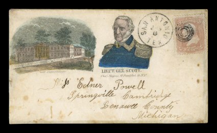 1057 c 65 image#65, 3c Rose, tied to two-part Charles Magnus multicolor showing the War Department Building and Lieutenant General Scott, with Magnus imprint, of most interest is that this Union patriotic is used out of Texas which was Confederate for nearly all of the war with occupation forces coming in only at the very end, stamp tied by "San Antonio/Tex/Jan 3" duplex, light staining and small tone spot to cover, fine; both a rare design as well as a scarce usage, probably posted just after the war; ex-Bleuler. (Image) Est. $500-750